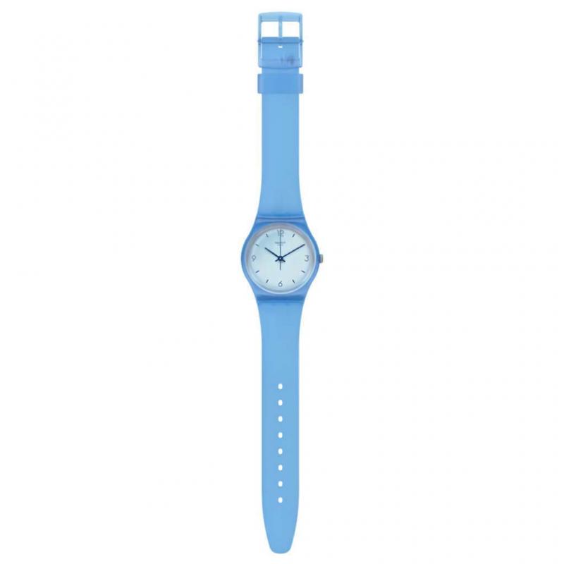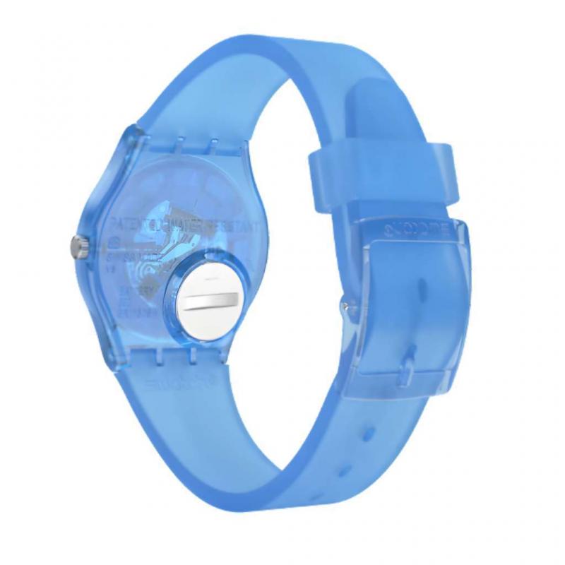 Dilengkapi kaca Swatch Solar Spectrum yang menciptakan efek cermin, jam tangan Gent ini mudah menarik perhatian. Dial putih dengan cetakan biru tampil kontras dengan case biru transparan mengilap berbahan polymer. Dipadukan dengan strap silikon serta loop silikon biru matte semi-transparan, dan buckle polymer biru mengilap, memberikan tampilan modern dan standout.